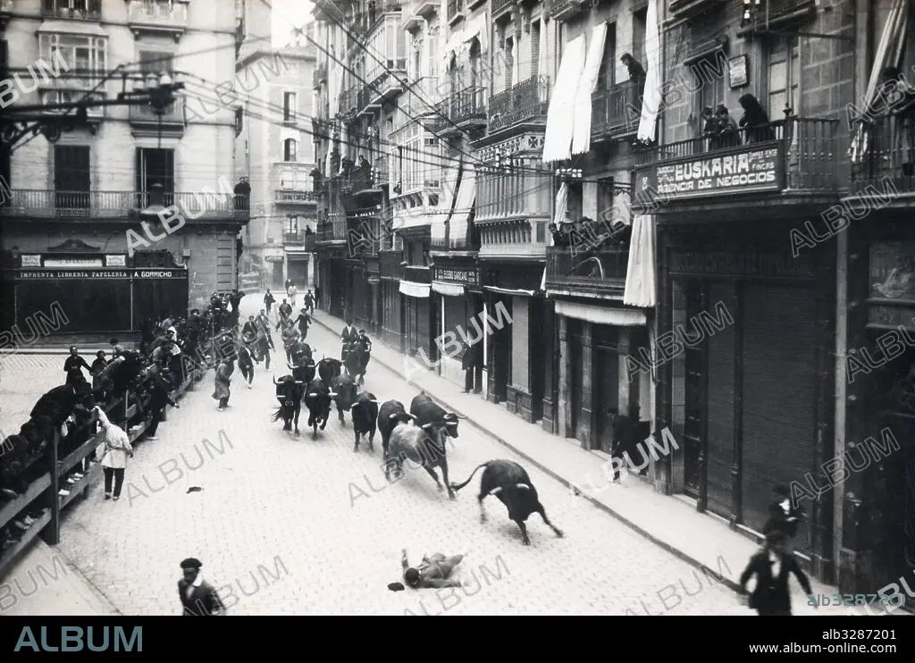 España. Navarra. Fiestas de San Fermín. Encierro de toros en Pamplona. Tarjeta postal. Años 1920