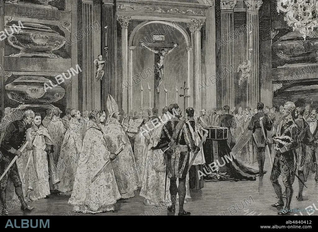 Maria Christina of the Two Sicilies (1806-1878). Queen consort of Spain (1829-1833) and queen regent (1833-1840) during the minority of Isabella II. Fourth wife of King Ferdinand VII. El Escorial. Response for Queen Maria Christina as her body is laid to rest in the Royal Pantheon crypt. Drawing from life by Gerardo Meléndez. Engraving by Capuz. La Ilustración Española y Americana (The Spanish and American Illustration), 1878.
