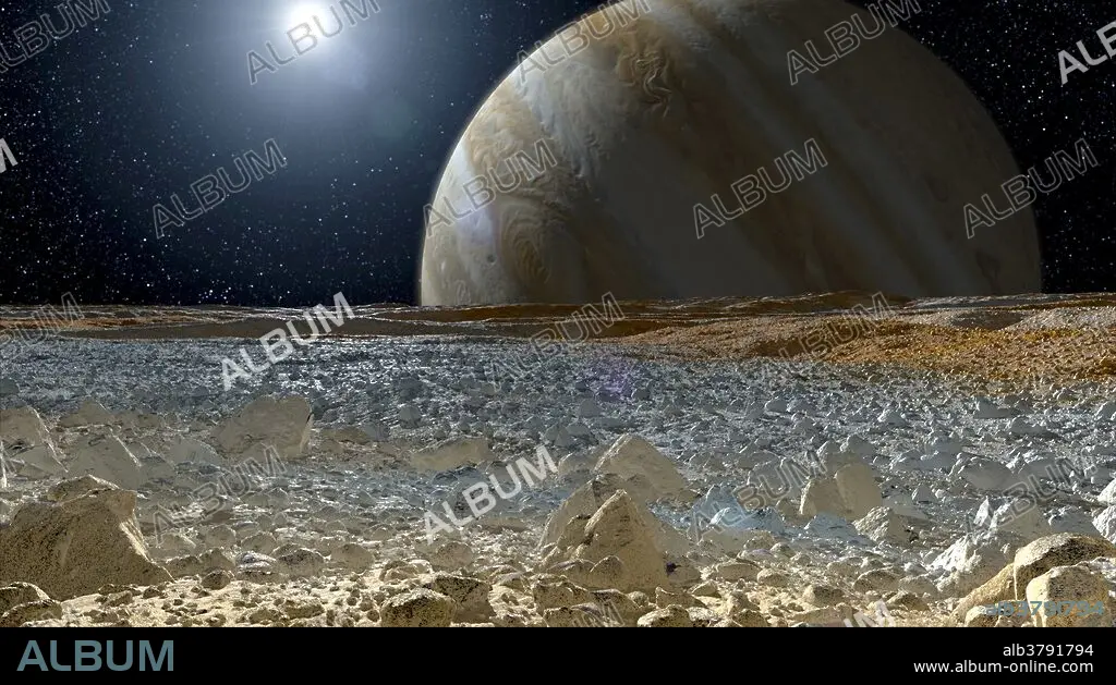 Title: Jupiter Seen from the Surface of Europa