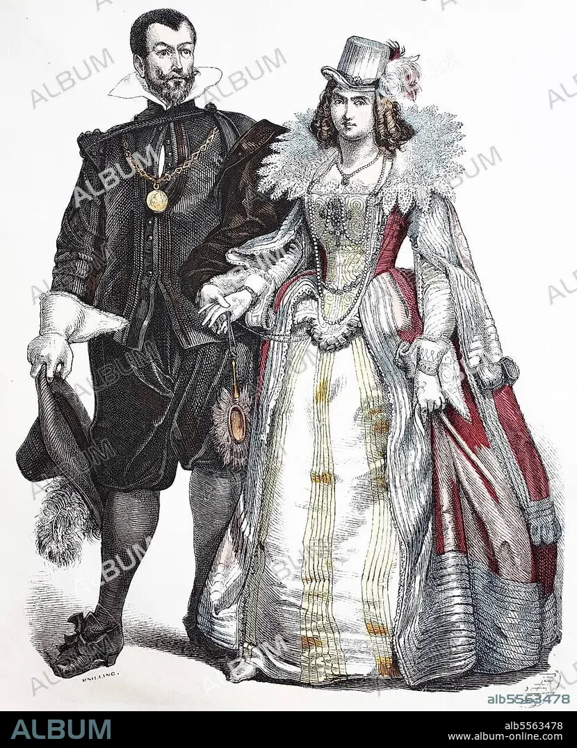 Caption: Folk traditional costume, clothing, history of costumes, Spanish court costume in the Netherlands, 1600-1635, Historic, digitally restored reproduction of a 19th century original, exact date unknown