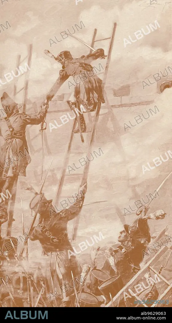 Caption: 'Marbot and Labédoyère Scaling the Wall at Ratisbon', 1809, (1896). Jean Baptiste Marbot and Charles François Huchet de la Bédoyère scaling the walls during the Battle of Ratisbon or Regensburg, in Germany, 23 April 1809. Engraving after the aquarelle by Eric Pape. From Life of Napoleon Bonaparte, Volume III, by William Milligan Sloane. [The Century Co., New York, 1896]