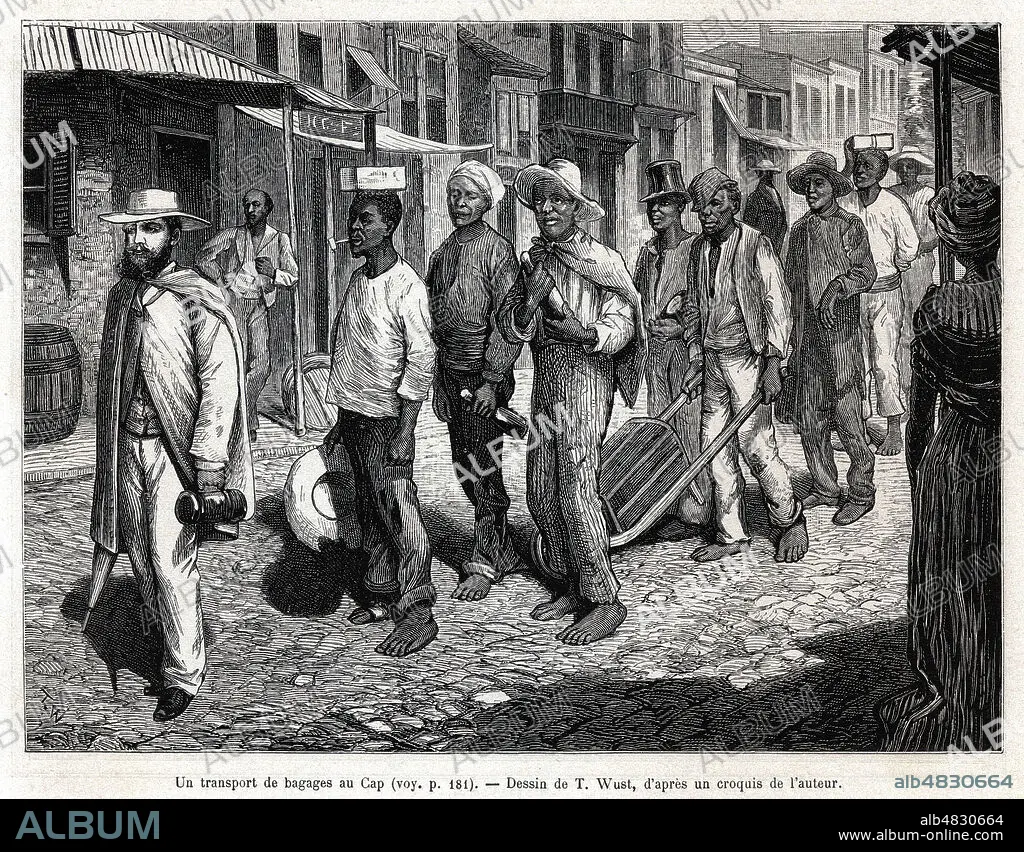 Un transport de bagages au Cap-Haitien. Illustration de T. WUST (19 s.) pour La Republique d'Haiti par Edgar LA SELVE (1849-1892) repris dans Le Tour du Monde de 1879. Credit : Collection Kharbine-Tapabor
