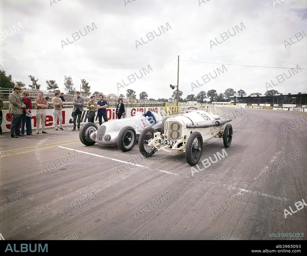 A 1914 and 1937 Grand Prix Mercedes racing car at the starting line. The first ever 1-2-3 finish in a grand prix was achieved by Mercedes in 1914 with the model on the right at the French Grand Prix at Lyons. The car on the left is a Mercedes-Benz W125 car and was the most powerful Grand Prix car at the time.