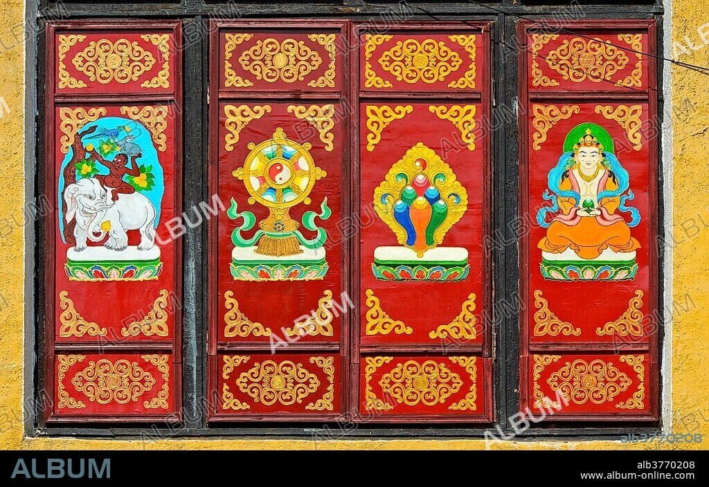 Traditional Buddhist motifs on wall, Gandan Monastery, Ulaanbaatar, Mongolia, Asia.