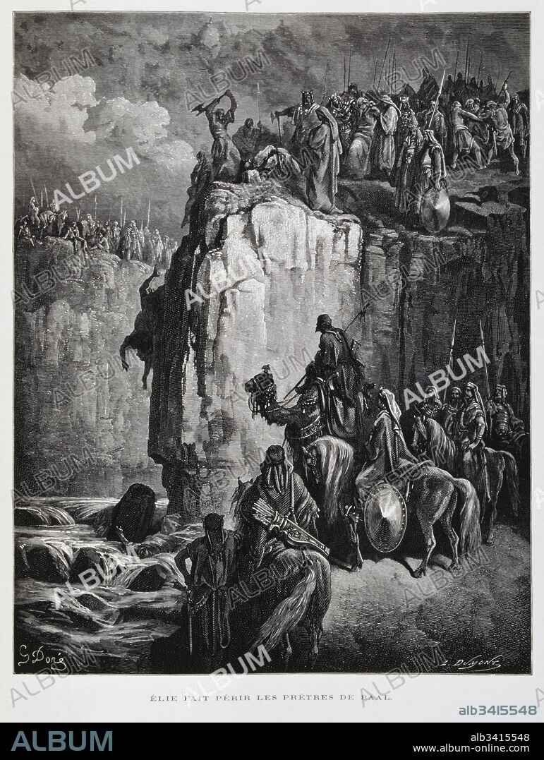 Elie smashes the idols of Baal, Illustration from the Dore Bible 1866. In 1866, the French artist and illustrator Gustave Doré (1832–1883), published a series of 241 wood engravings for a new deluxe edition of the 1843 French translation of the Vulgate Bible, popularly known as the Bible de Tours. This new edition was known as La Grande Bible de Tours and its illustrations were immensely successful..