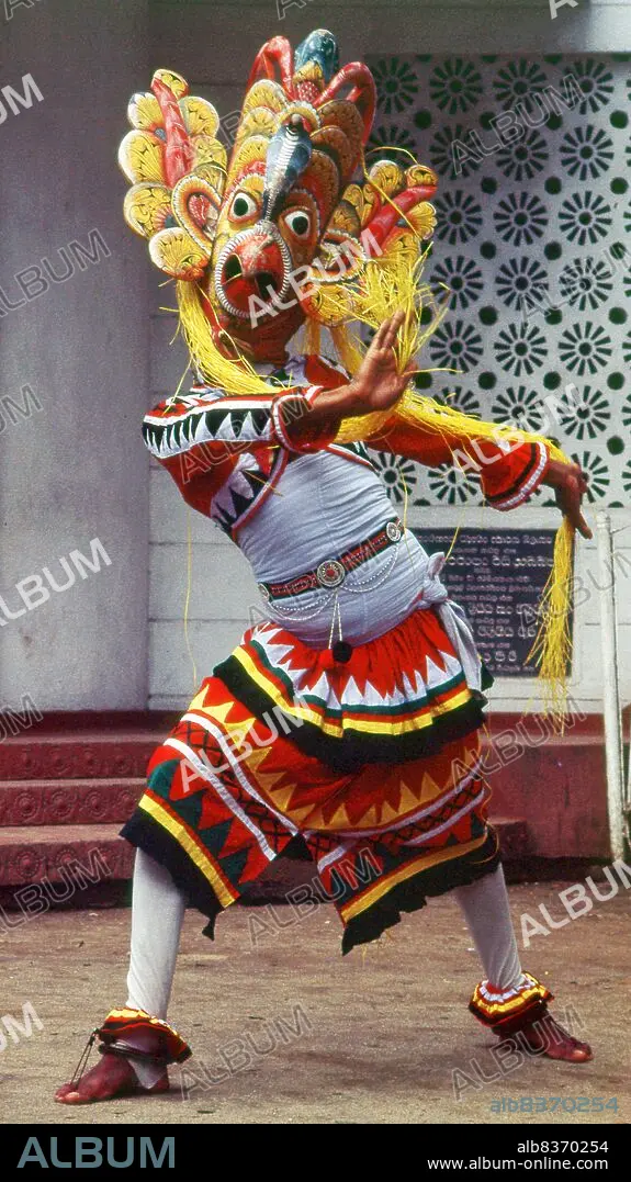 Sri Lanka: Traditional Ruhunu dancer with mask and a drummer with his Yak Bera drum (1997)