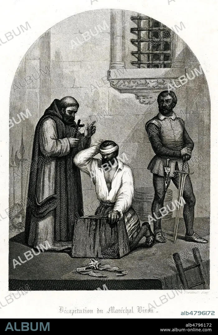 Decapitation du Marechal BIRON (1524-1592). Illustration de 1844 par MARKL pour Histoire de la Bastille par A. ARNOULD, ALBOIZE du PUJOL et Auguste MAQUET. Credit : Collection Jonas/Kharbine-Tapabor.
