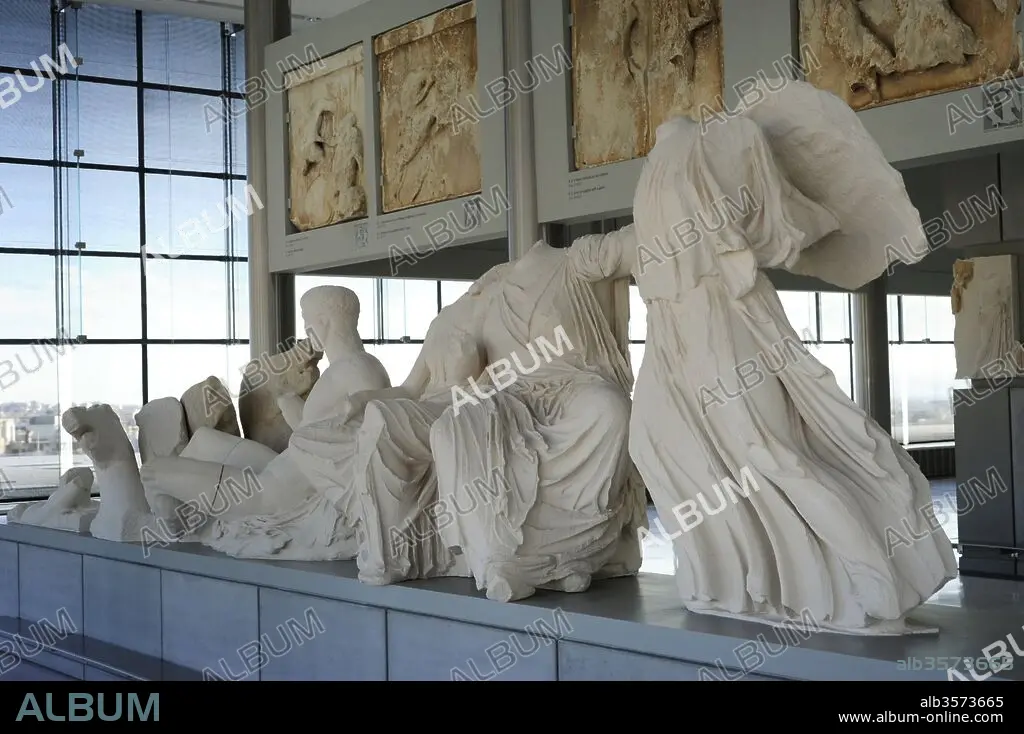 Caption: East pediment of the Parthenon. Birth of Athena. 5th century BC. Replica. Acropolis Museum. Athens. Greece. Original remains are exposed in the British Museum, London.