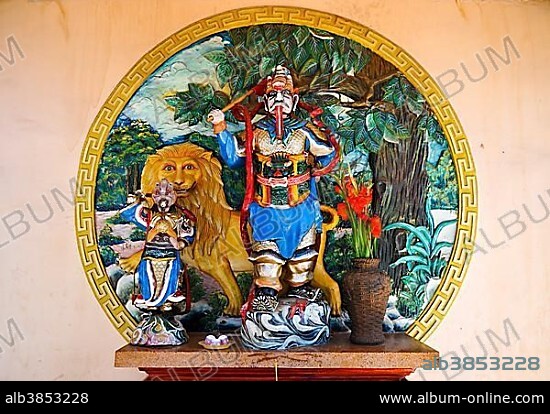 Statue on a wall, Buddhist god, temple on the mountain of the black woman, Nui Ba Den, Tay Ninh, Vietnam, Asia.
