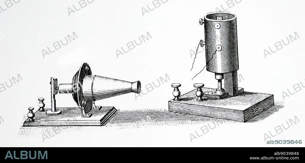 Caption: Alexander Graham Bell's (1847-1922) telephone, exhibited at the Philadelphia Centennial Exhibition of 1876. This was his second and successful instrument. Left: the transmitter. Right: the receiver. London, 1885