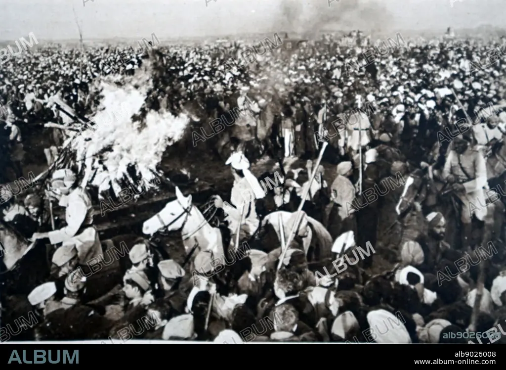 Caption: Photograph taking during the cremation of Mahatma Gandhi. Mohandas Karamchand Gandhi (1869-1948) an Indian lawyer, anti-colonial nationalist, and political ethicist.