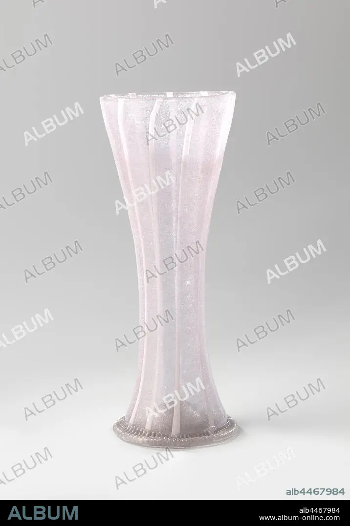 Caption: Filigree glass cup, Cup with inserted bottom. Ribbed, colorless stand ring. Concave body with vertical fused opaque white threads., anonymous, West-Europa, c. 1675 - c. 1700, glass, glassblowing, h 22.1 cm × d 8.2 cm