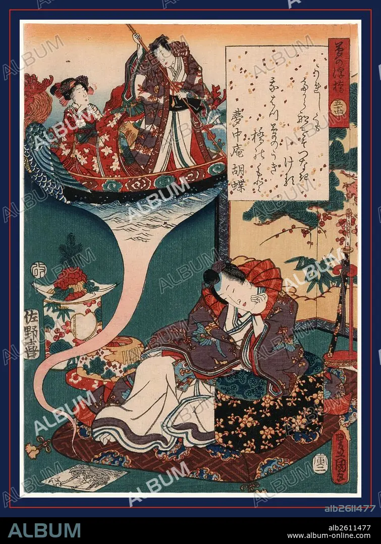 Caption: Yume no ukihashi, Dream Ukihashi., Utagawa, Toyokuni, 1786-1865, artist, 1854., 1 print : woodcut, color ; 24.8 x 17.7 cm., Floating bridge of dreams. The poem in the image is a pun on the last chapter of Genji.