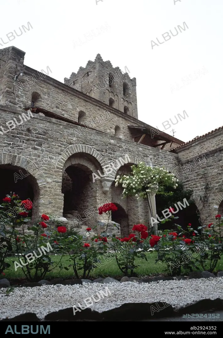 Caption: France. Pyrenees-Orientales. Languedoc-Roussillon region. Abbey of Saint-Martin-du-Canigou. Monastery built in 1009, on Canigou mountain. It was built from 1005-1009 by Guifred, Count of Cerdanya in Romanesque style. Cloister. Restoration of 1900-1920. The firts level was built in early 11th century, the second one was built in late 12th century.