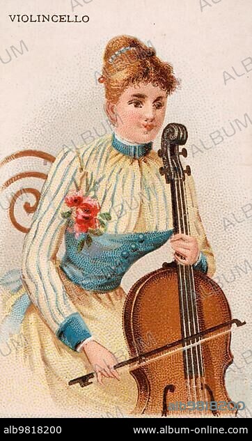 Musical instruments; Woman playing a musical instrument; Violincello; Cello; Historical; digital reproduction of a 19th century collector's picture