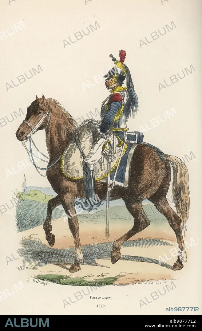 Caption: Uniform of a French cuirassier, heavy cavalry, 1809. In steel helmet with brass comb, red plume, steel cuirass over blue coat with red epaulettes and yellow collar (possibly the 7th Cuirassiers regiment). Armed with straight sword. Cuirassier, 1809. Handcoloured woodcut by Andrew Best Leloir after an illustration by Hippolyte Bellangé from P.M. Laurent de lArdeches Histoire de Napoleon, Paris, 1840.