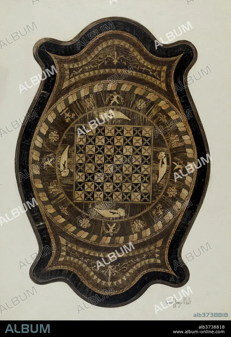 Caption: Marquetry Table: Showing Inlay Top. Dated: 1937. Dimensions: overall: 34.3 x 24.6 cm (13 1/2 x 9 11/16 in.) Original IAD Object: 27 1/2"x41 1/2"x27 high. Medium: watercolor, colored pencil, pen and ink, and graphite on paperboard.