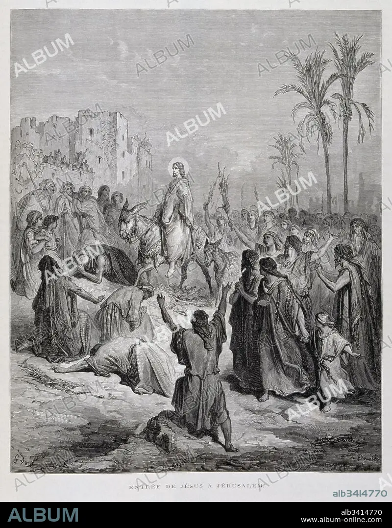 Caption: Engraving by Gustave Doré (1832-1883); Jesus' triumphal entry into Jerusalem on a donkey. Jesus descends from the Mount of Olives towards Jerusalem, and the crowds lay their clothes on the ground to welcome him as he triumphantly enters Jerusalem.