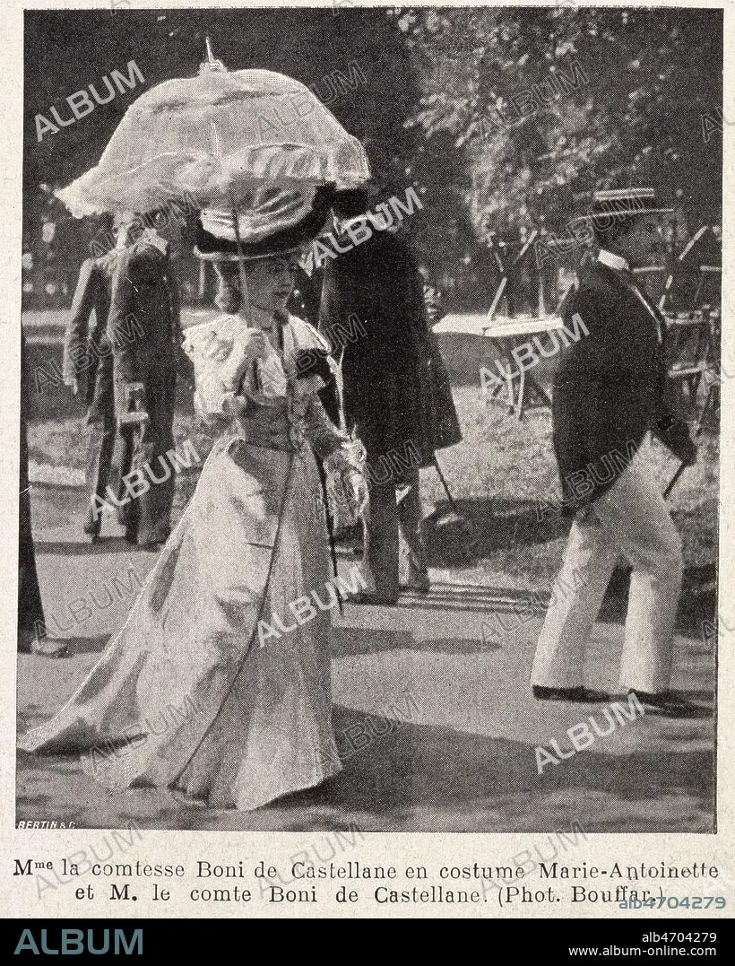 Fete au Trianon a Versailles : 'Mme la comtesse Boni de Castellane en costume Marie-Antoinette et M. le comte de Castellane'. Photographie Bouffar in. La Vie Illustree du 05/07/1901. Credit : Collection KHARBINE-TAPABOR.