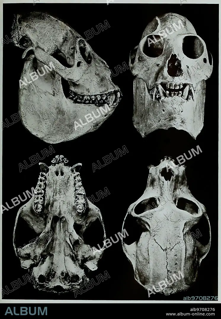 Skull bones, research, evolution, research piece, red-handed howler monkey, Alouatta belzebul, primate species from the genus of howler monkeys within the spider-tailed monkeys, historical, digitally restored reproduction of an original artwork from the 19th century, exact original date not known
