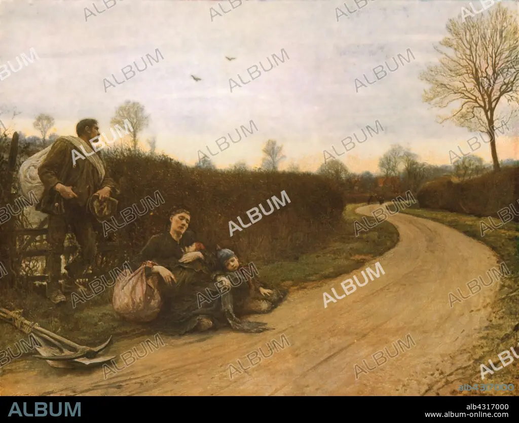 Caption: 'Hard Times', 1885, (c1930). A family rest by the side of the road. The father's tools, tied in a bundle, indicate that he is looking for manual labour. Painting in the Manchester Art Gallery, Manchester. From "Modern Masterpieces of British Art". [The Amalgamated Press Ltd., London, c1930]