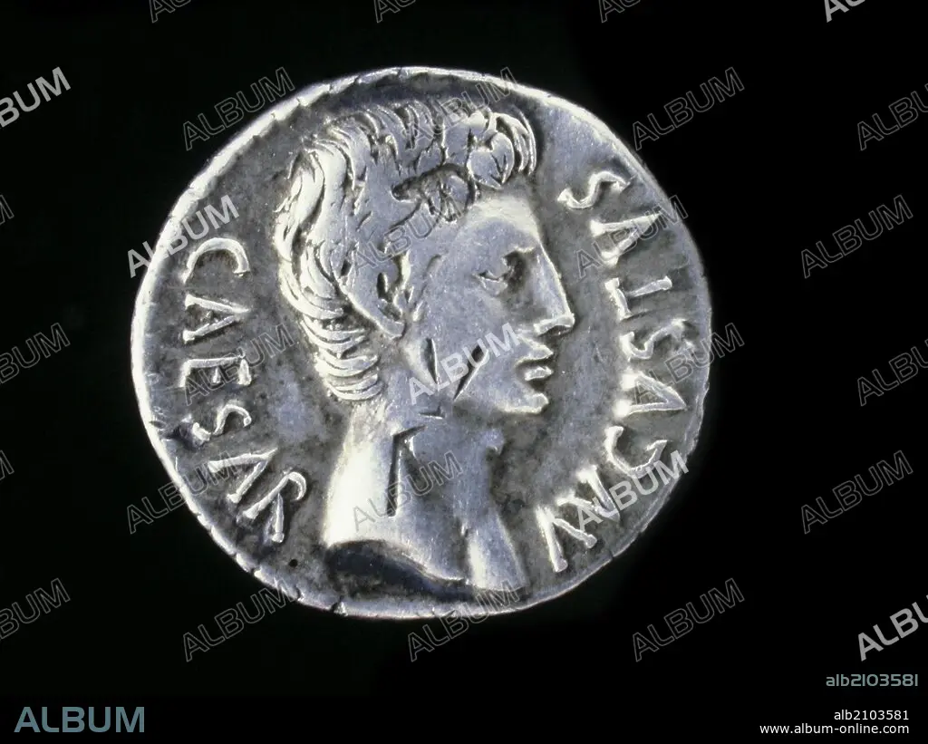 NUMISMATICA. MONEDA IMPERIO ROMANO. DENARIO DE PLATA, DE AUGUSTO. ANVERSO. CABEZA DESNUDA A LA DERECHA. 25 A.C. (DEPOSITO: MUSEO ARQUEOLOGICO NACIONAL)