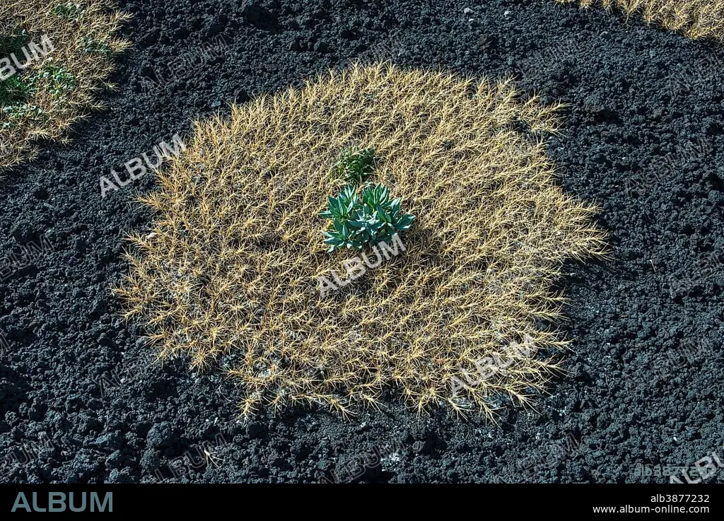 Caption: Sicilian milkvetch (Astragalus siculus), endemic pioneer plant on lava field of 1928, Mount Etna, volcano, northeast flank, 2100 meters, Sicily, Italy, Europe