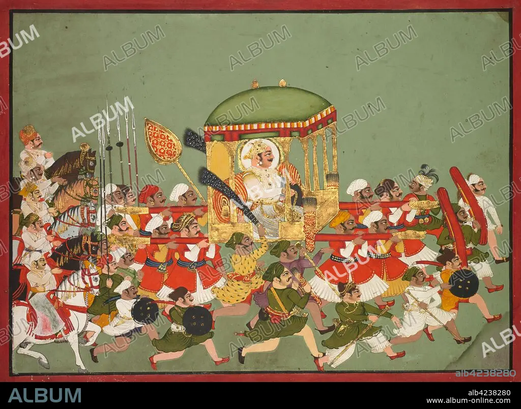 Caption: Maharao Chattar Sal (reigned 1758–64) of Kota in a Palanquin, c. 1760. Northwestern India, Rajasthan, Kota. Color and gold on paper; overall: 28.3 x 39.2 cm (11 1/8 x 15 7/16 in.); with borders: 31.6 x 42.7 cm (12 7/16 x 16 13/16 in.).