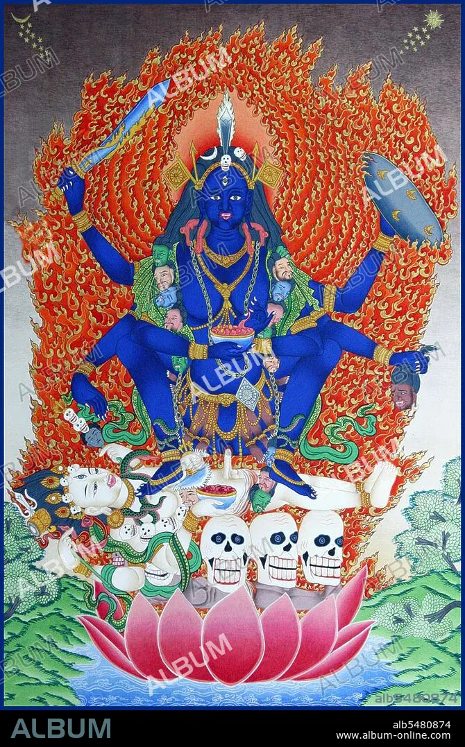 Caption: Kali is the Hindu goddess associated with eternal energy. 'She who destroys'. The name Kali comes from kala, which means black, time, death, lord of death, Shiva. Kali means 'the black one'. Since Shiva is called Kala - the eternal time, Kali, his consort, also means 'Time' or 'Death' (as in time has come). Hence, Kali is considered the goddess of time and change. Although sometimes presented as dark and violent, her earliest incarnation as a figure of annihilation still has some influence. Various Shakta Hindu cosmologies, as well as Shakta Tantric beliefs, worship her as the ultimate reality or Brahman. She is also revered as Bhavatarini (literally 'redeemer of the universe'). Kali is represented as the consort of Lord Shiva, on whose body she is often seen standing. She is associated with many other Hindu goddesses like Durga, Bhadrakali, Sati, Rudrani, Parvati and Chamunda. She is the foremost among the Dasa Mahavidyas, ten fierce Tantric goddesses.