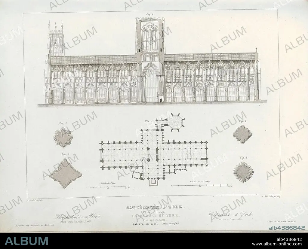 York Cathedral, Floor plan and longitudinal section of the York Minster, signed: Arundale del, A. Ribault sculp, Pl., 53, Arundale (del.); Ribault, A. (sc.), 1853, Jules Gailhabaud: Monuments anciens et modernes: collection formant une histoire de l'architecture des différents peuples à toutes les époques. Paris: Librairie de Firmin Didot frères, 1853