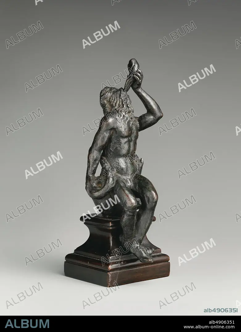 Caption: Severo Calzetta da Ravenna, Neptune Seated on a Marine Monster and Blowing a Conch Shell, Italian, Ravenna or Padua, Severo Calzetta da Ravenna (Italian, active by 1496, died before 1543), late 15th century, Italian, Ravenna or Padua, Bronze, wood pedestal, Overall: 7 1/8 × 3 × 3 in. (18.1 × 7.6 × 7.6 cm), Sculpture-Bronze