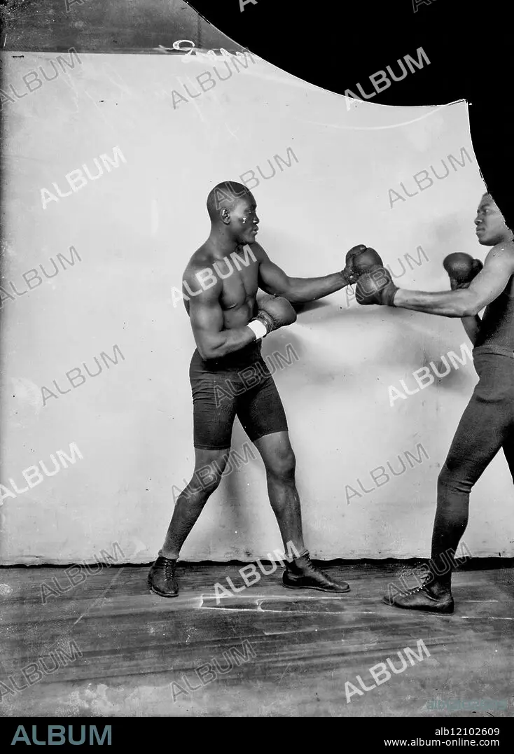 Caption: Boxer Jack Johnson in a fighting stance with an unidentified opponent in Chicago, Illinois, 1909.