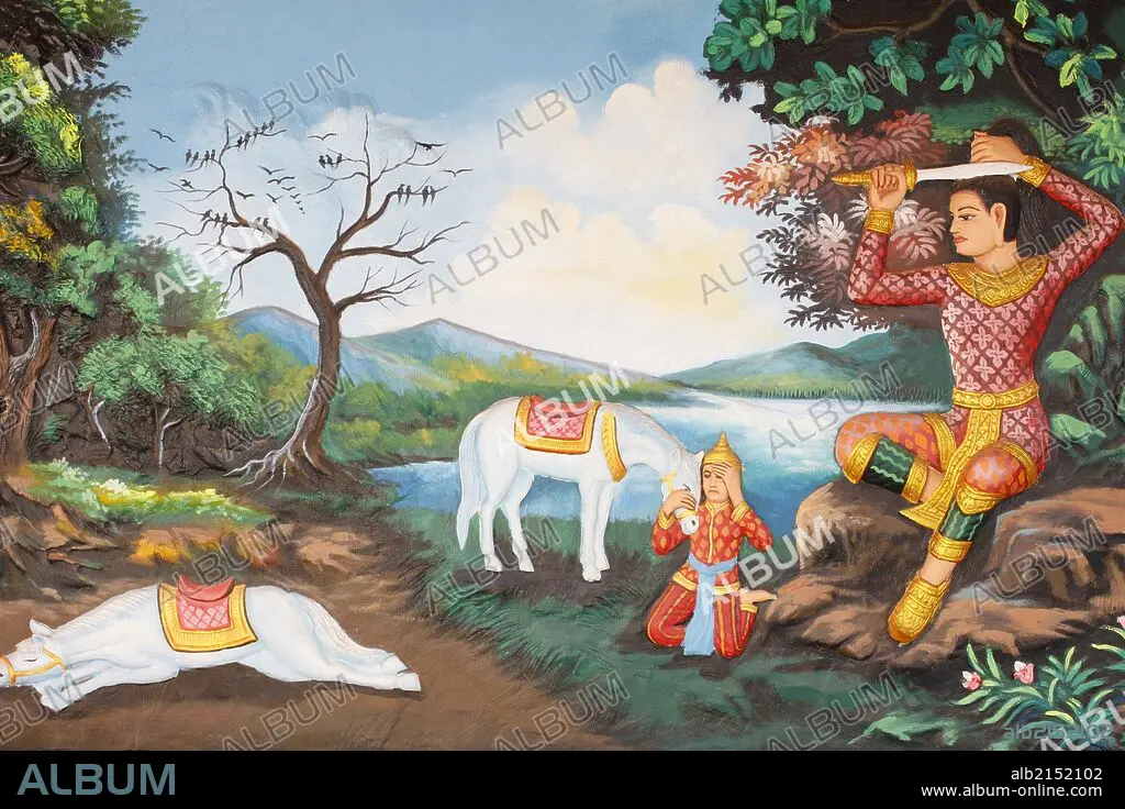Preah Prom Rath Monastery. Life of the Buddha. The Great Tonsure: the Buddha cuts his hair with his sword. Then he changed his prince's clothes for a beggar's robe. Then he began his quest for enlightenment.