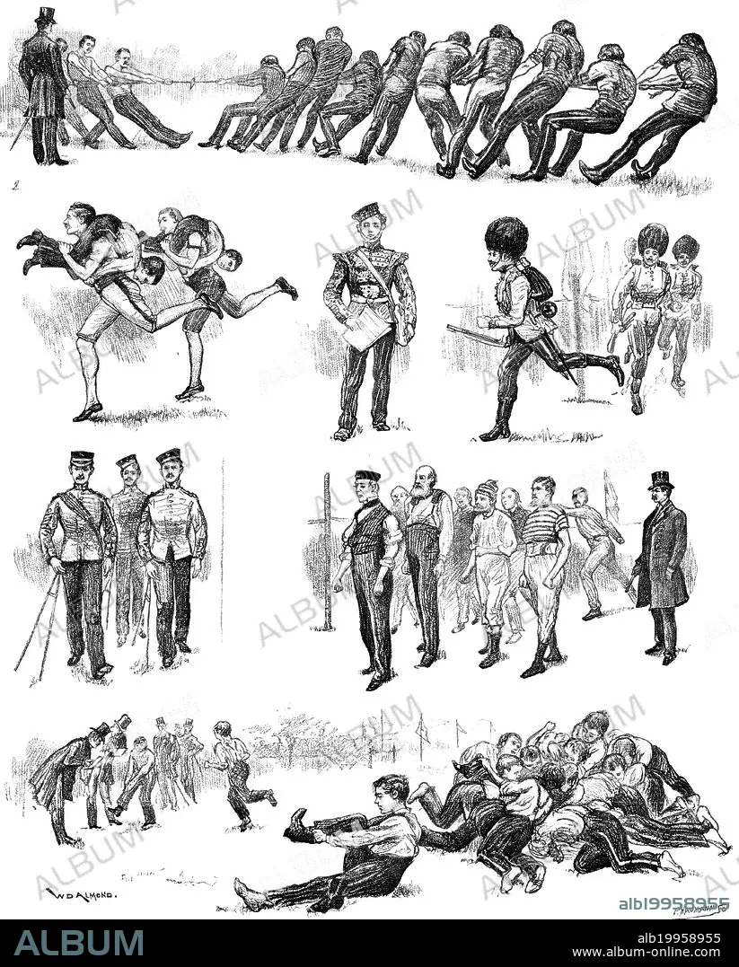 Caption: The Garrison of London at play: athletic sports at Burton's Court, Chelsea, 1890. '1. Tug of War. 2. Jockey Race. 3. Programme Boy. 4. Marching-Order Race. 5. Pace-Stick Race. 6. Pensioners' Race: Leader 76 years of age. 7. Boot Race for boys of Duke of York's School...The officers, non-commissioned officers, and privates of the Household Brigade and other regiments stationed in London joined in a public display of military and athletic exercises...at Burton's Court, Chelsea. Major-General Philip Smith, commanding the Home District, visited the ground; and Colonel Paget, of the Scots Guards, Colonel Thynne, Grenadier Guards, Colonel Montgomery, Captain Dalrymple, and other officers acted as judges or starters. Foot-races were not the least interesting part of the competitive performances, and there was a short one for old Chelsea Pensioners, handicapped according to their age; eleven of them ran, one being in his seventy-sixth year, and coming in third. The mile race was won by Private Green, of the 1st Scots Guards. Policemen of the A and B Divisions...had races of their own. The Scots Guards defeated the Grenadier Guards in the "Tug of War." The Grenadier Guards' band, and that of another regiment, enlivened the assembly with music'. From "Illustrated London News", 1890.