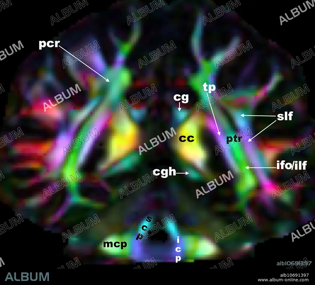 Caption: This coronal (from the front) colour DTI (diffusion tensor imaging) image depicts the major white matter tracts in the brain. By convention tracts oriented from anterior to posterior (front to back) are green, tracts oriented from side to side are red and those tracts oriented superior to inferior (head to toe) are blue.