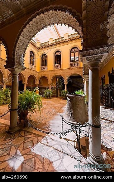 16th century palace with Arabian architecture, courtyard with artistic arcade and Roman mosaic, Palacio de la Condesa de Lebrija, Seville, Andalusia, Spain