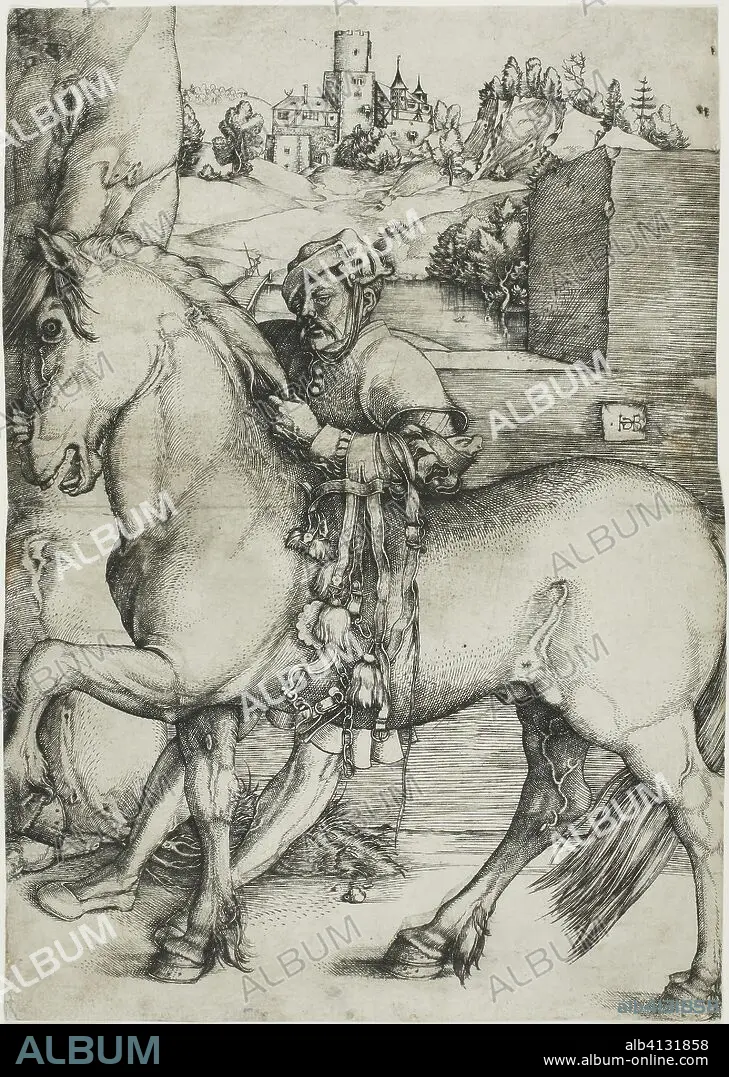 A Groom Bridling a Horse. Hans Baldung Grien; German, c. 1480-1545. Date: 1540-1545. Dimensions: 278 x 197 mm (image/sheet trimmed within platemark). Engraving in black on ivory laid paper. Origin: Germany.