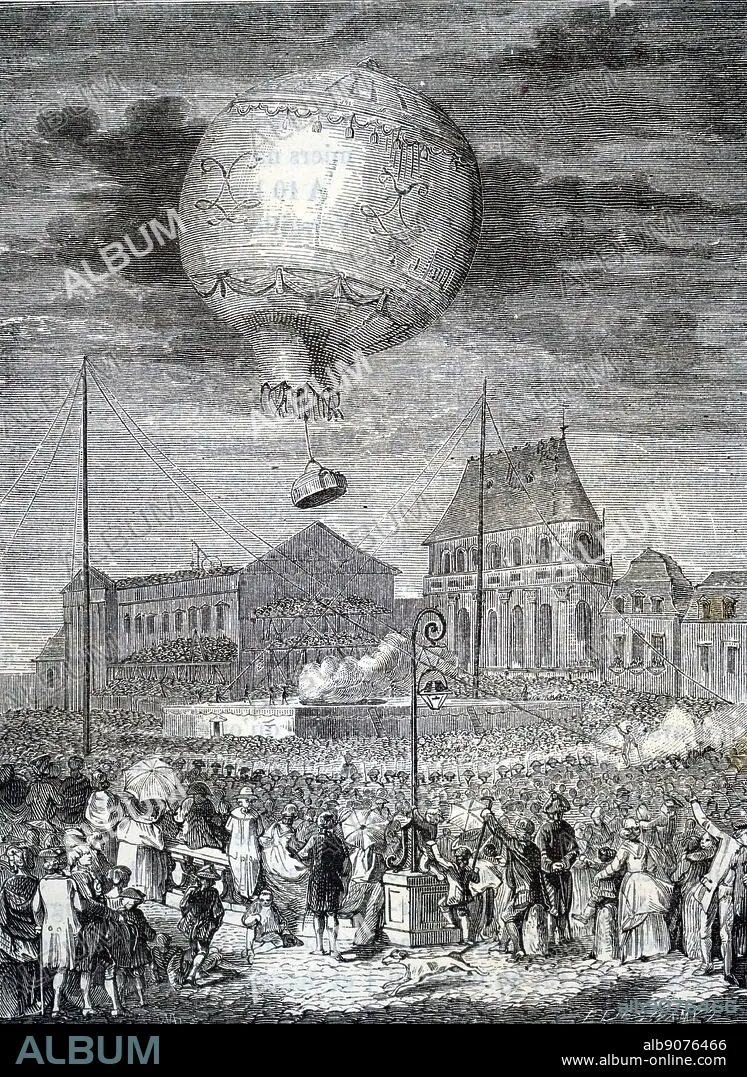 Caption: Engraving depicting the Montgolfier brothers making a hot-air balloon ascent at Versailles in front of the French royal family in 1783. Joseph-Michel Montgolfier and Jacques-Étienne Montgolfier were paper manufacturers from Annonay, in Ardèche, France best known as inventors of the Montgolfière-style hot air balloon, globe aérostatique. Dated 19th century
