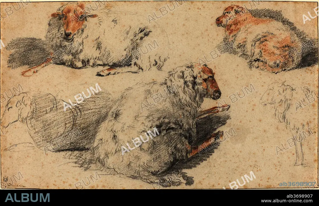Caption: Sheep. Dimensions: overall: 15 x 25.5 cm (5 7/8 x 10 1/16 in.). Medium: black and red chalk (possibly crayon).