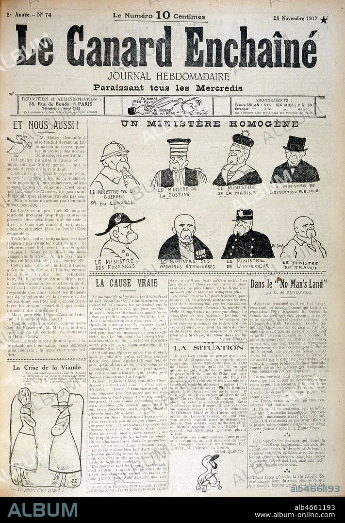 'Un ministere homogene', Georges CLEMENCEAU (1841-1929) deguise en differents ministres, caricature par Henry Paul GASSIER (1883-1951) in Le Canard Enchaine, 1917. Credit : Coll. Dixmier/KHARBINE-TAPABOR.