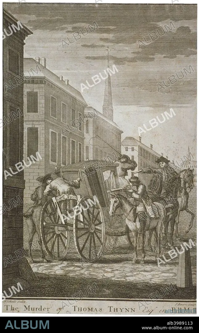 Caption: Scene of Thomas Thynne's murder in Pall Mall, Westminster, London, 1682 (c1775). Scene showing two men on horseback shooting their victim in his carriage. A wealthy landowner and MP for Wiltshire, Thomas Thynne married Lady Elizabeth Percy, daughter of the Earl of Northumberland, in 1681 but was then assassinated the following year by Count Karl Johann von Konigsmark, a rival suitor. Konigsmark was acquitted of the crime, allegedly due to corruption of the jury, but his accomplices, Christopher Vratz, John Stern and Charles George Borosky, were hanged.