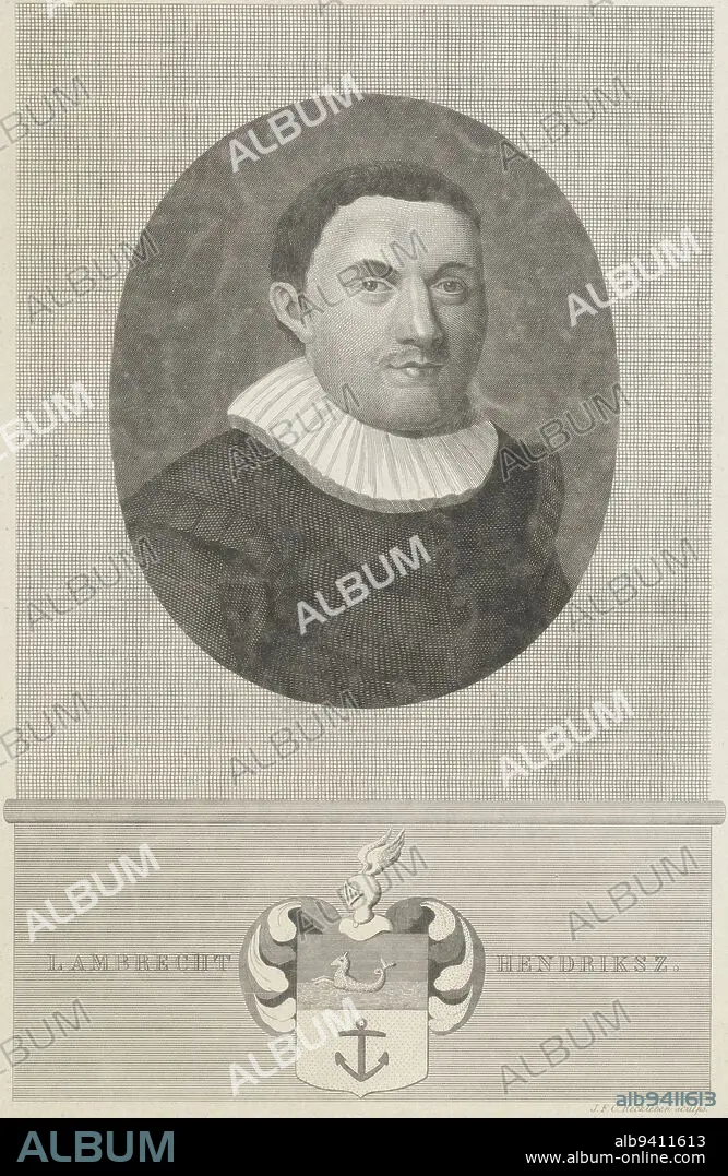 Caption: Portrait of ship's captain Lambrecht Hendriksz Verhouven He had the nickname Mooy Lambert In the margin his name and family crest, Portrait of Lambrecht Hendriksz Verhouven, print maker: Jan Frederik Christiaan Reckleben, (mentioned on object), Amsterdam, 1858 - 1860, paper, steel engraving, h 250 mm × w 166 mm