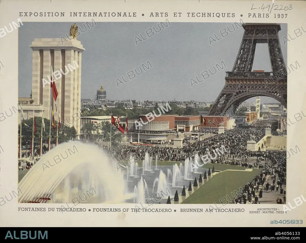 Caption: Fountains of the Trocadero. Exposition internationale des arts et des techniques appliqueÌs aÌ€ la vie moderne, Paris, 1937. Album officiel. [Paris : Exposition internationale des arts et techniques], 1937. The International Exposition dedicated to Art and Technology in Modern Life) was held from 25 May to 25 November 1937 in Paris, France. Source: L.49/2203 plate 1. Language: French.