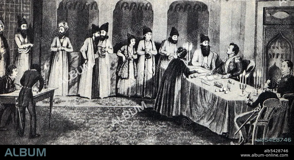 Title: 1882. Conclusion of peace between Russia and Iran. A. S. Griboyedov. ' Griboedov or Sergeyevich Griboyedov, formerly Romanised as Alexander Sergeyevich Griboyedoff, was a Russian diplomat, playwright, poet, and composer