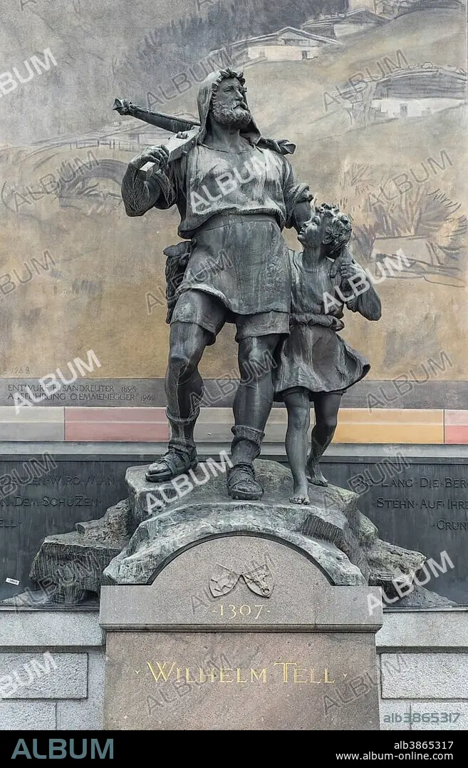 Caption: Wilhelm Tell monument, inaugurated in 1895, sculptor Richard Kissling, Altdorf, Uri, Switzerland, Europe