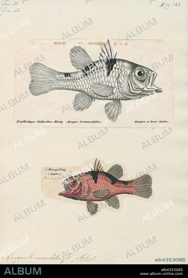 Caption: Apogon trimaculatus, Print, Pristicon trimaculatus, the 'three-spot cardinalfish, is a nocturnal fish that lives in the Western Pacific Ocean, living around inshore coral reefs in waters around the Ryukyu Islands and Western Australia and the southern Great Barrier Reef, east to Samoa and the Marshall Islands. This species is uncommon. Juveniles have intense, dark markings on a light background, while adults' markings are dusky.