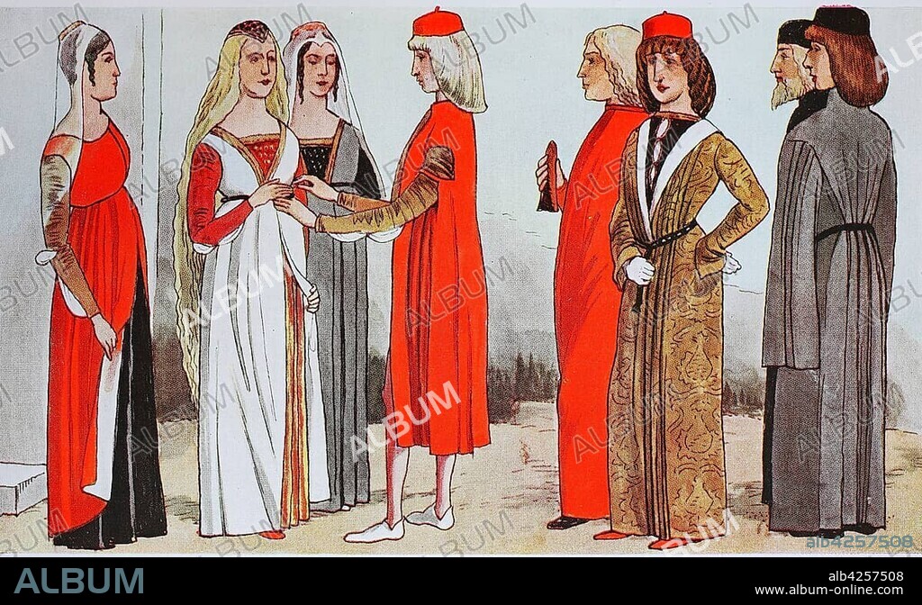 Caption: Clothing, fashion in Italy at the time of the early Renaissance around 1460-1490, illustration, Italy, Europe