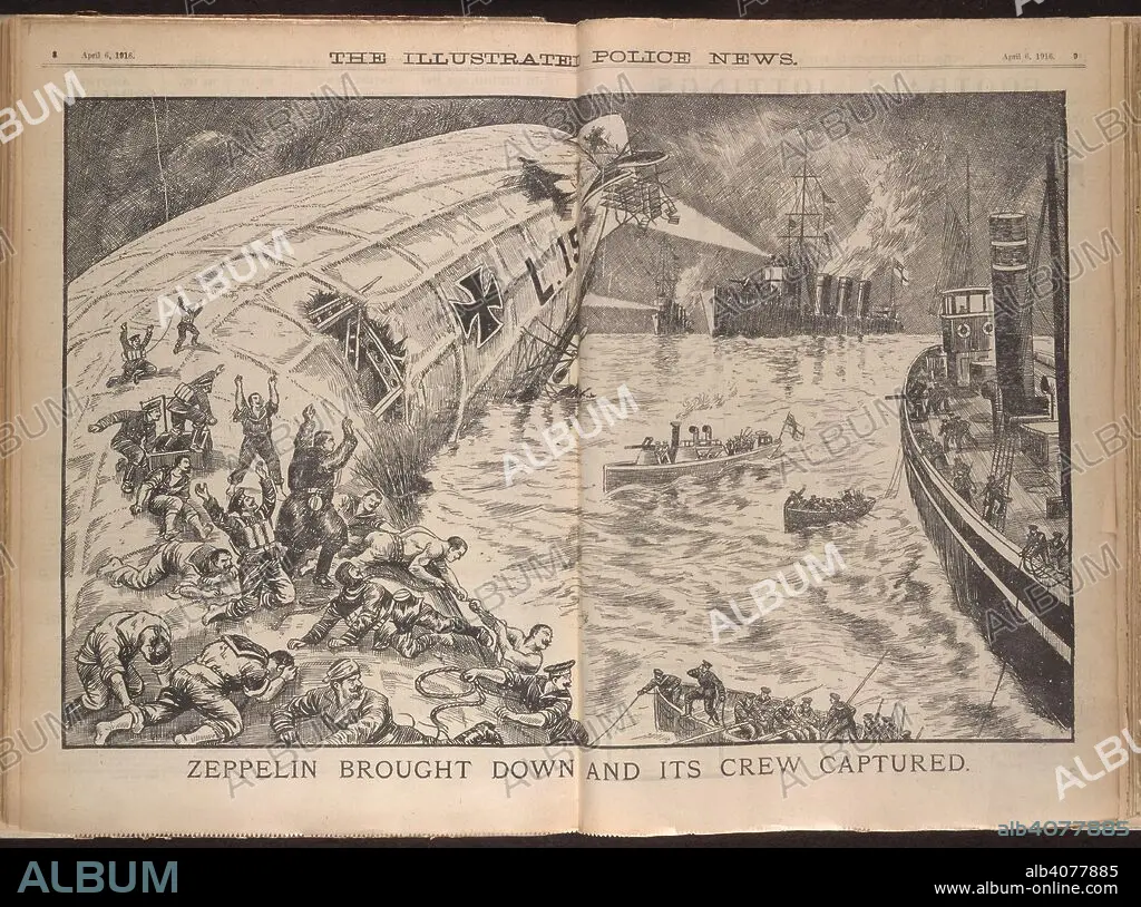 Caption: Zeppelin brought down and its crew captured.' A Zeppelin is a type of rigid airship pioneered by the German Count Ferdinand von Zeppelin in the early 20th century. After the outbreak of the First World War, the German military made extensive use of Zeppelins as bombers and scouts. The Illustrated Police News. 1916. Source: Illustrated Police News, 6 April 1916 page 9.