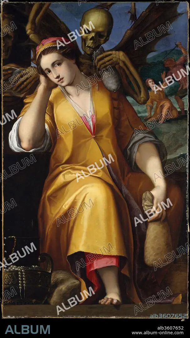 In 1590 Ligozzi created a series of elaborate, allegorical drawings of the Seven Deadly Sins (six still exist). This painting, which is a fragment, depicts the central figures of the allegory of Avarice, the drawing for which is in the National Gallery, Washington. As described in emblem books, Avarice is shown as a pale woman holding a bag of money. The threatening skeleton suggests that the artist was inspired as well by other representations of the vice in either literature (perhaps Dante) or the visual arts.