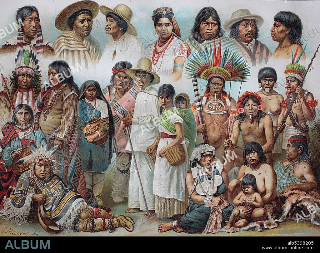 Caption: Ethnic groups of America: 1 Labrador Inuit woman, 2 Mexican, 3 Highland Mexican, 4 Yucatan Mexican, 5 Indians from Ecuador, 6 Indians from Peru, 7 Ipurina, 8 Sioux, 9 +10. Apaches, 11 Bellacoola, 12 +13. Pueblo Indians, 14 +15. Zapoteca, 16 Bororo, 17 Caraja, 18 Botokudin, 19 Omagua from Brazil, 20 Araucanian from Chile, 21 +22. Fuegians, 23 Patagonian, historical illustration, wood engraving, circa 1888